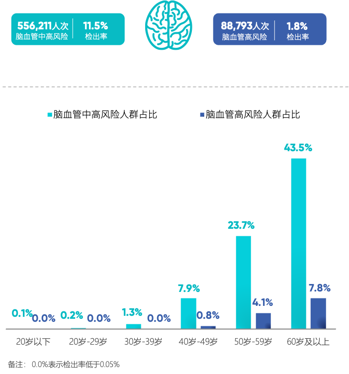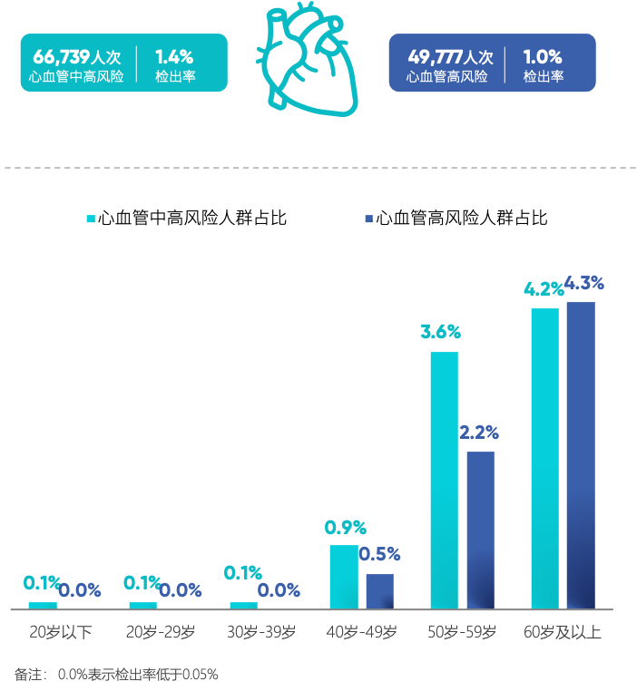 此外,《蓝皮书》共检出致盲性疾病58,088人次,检出率为1.1%,占整体异常比例的1.4%。建议40岁及以上人群重视眼健康,定期进行眼底检查。鹰瞳科技通过大数据的人工智能学习,可以评估心脑血管疾病风险,数据显示40岁时心脑血管风险显著增加。