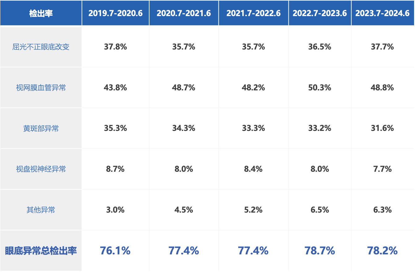 《蓝皮书》显示,超500万人次的人工智能视网膜健康评估中,整体异常检出率为77.4%,且呈上升趋势。视网膜血管异常、屈光不正眼底改变、黄斑部异常、视盘视神经异常是主要眼底异常,其中屈光不正眼底改变增长明显,与近视高发趋势有关。