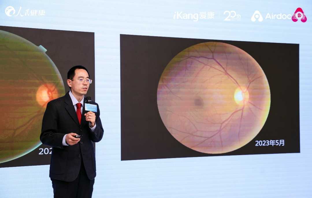 会上,张女士分享了她在爱康君安健疗国际北京旗舰中心接受体检时,通过新增的人工智能视网膜健康评估项目发现视网膜脱离征兆的经历,强调了眼底检查的重要性。张黎刚指出,多次检测的眼底数据变化有助于发现眼底变化与全身疾病的关联。