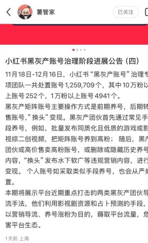 此外,小红书官方账号“薯管家”于12月19日发布公告,宣布在11月18日至12月16日期间,共处置账号1259709个,其中包括10万粉以上账号252个和1万粉以上账号4941个。公告指出,黑灰产团伙通过养号、转售账号和发布违规营销内容等手段进行变现,对此平台将采取严格处置措施。