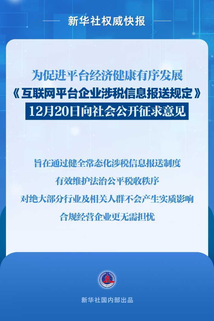 国家税务总局发布《互联网平台企业涉税信息报送规定》,并向社会公众广泛征求意见。规定要求企业报送平台上经营者和从业人员收入信息,税务部门将保密并确保数据安全。