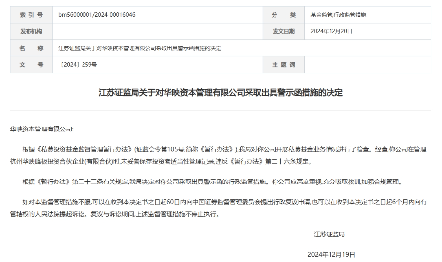 12月20日,江苏证监局对华映资本管理有限公司(简称“华映资本”)采取了出具警示函的行政监管措施。这一决定源于对华映资本开展私募基金业务情况的检查。