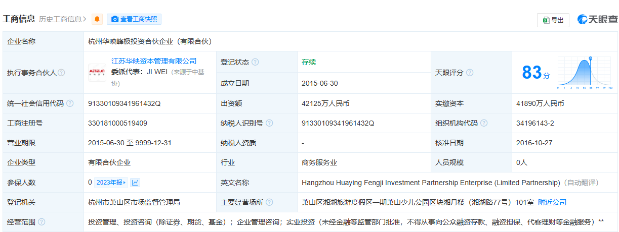 天眼查数据显示,杭州华映峰极投资合伙企业(有限合伙)成立于2015年6月,出资额为4.21亿元,由苏州工业园区八二五新媒体投资企业(有限合伙)、珠海久鼎宏源股权投资基金有限公司及束为等共同出资。该合伙企业的经营范围涵盖投资管理、投资咨询(除证券、期货、基金)、企业管理咨询及实业投资等,执行事务合伙人为华映资本。