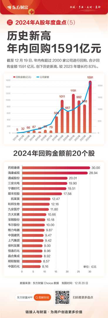 在一系列政策利好的推动下,2024年A股市场迎来了一波强劲的回购热潮。东方财富Choice数据显示,截至12月19日,今年A股市场的回购金额已高达1591亿元,成功刷新了年度历史新高,相较于2023年的868亿元,实现了约83%的大幅增长。而此前,年度回购金额的最高纪录是在2021年创造的,当时A股公司的回购金额为1191亿元。