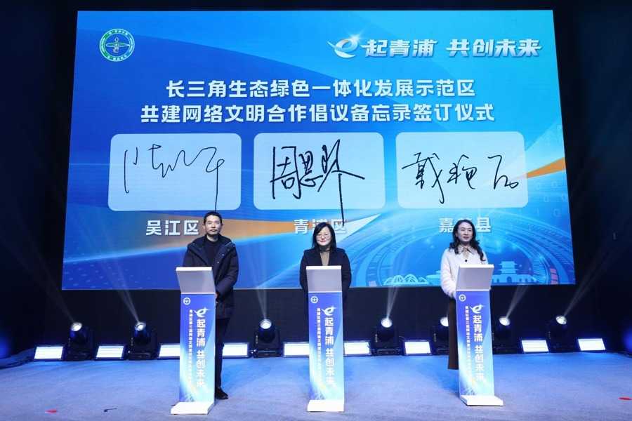 12月20日下午,上海市青浦区成功举办了主题为“e起青浦共创未来”的第三届网络文明建设优秀品牌发布活动。活动现场,青浦区与江苏省苏州市吴江区、浙江省嘉兴市嘉善县共同签署了《长三角生态绿色一体化发展示范区共建网络文明合作倡议备忘录》。