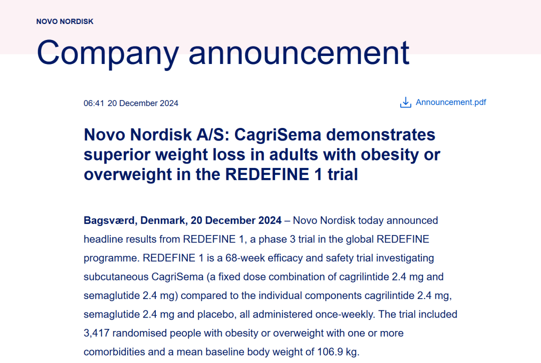 据悉,第二项关键性3期试验REDEFINE2的结果预计将于2025年上半年公布,该试验针对患有肥胖或超重的2型糖尿病成人。诺和诺德发言人称,完整的CagriSema结果将在明年的医学大会上公布,公司计划在2025年上半年开始一项新的试验,优化剂量调整,进一步探索CagriSema的减肥潜力。