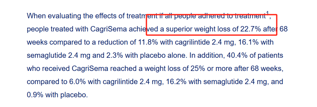 诺和诺德在周五发布的公告中透露,尽管CagriSema在第68周时与安慰剂相比,体重减轻效果具有统计学意义且更优,达到了主要终点,但超重患者减重22.7%,仍低于公司预期的25%。这一结果导致公司股价的大幅下跌。