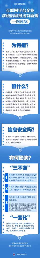 此外,规定还就减轻平台企业信息报送负担、保障信息安全和质量以及明确法律责任等方面进行了详细阐述。对于工信、人社及市场监管等部门已与税务部门共享的涉税信息,互联网平台企业无需重复报送。税务机关将为互联网平台企业提供安全可靠的报送渠道及高效便捷的服务。