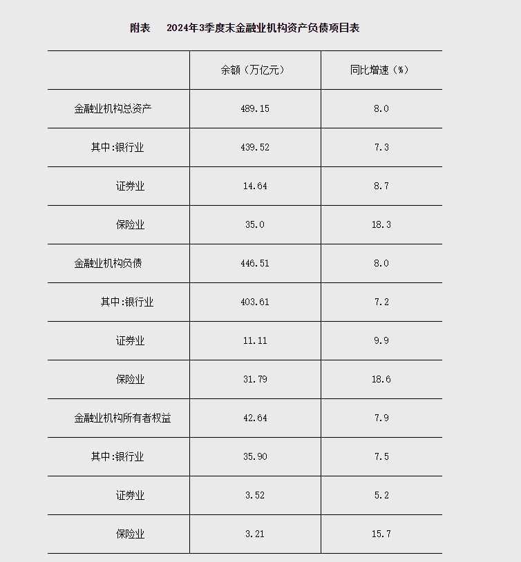 2024年3季度末,我国金融业机构总资产规模达到489.15万亿元,同比增长8.0%,其中银行业、证券业、保险业均呈现稳健增长态势。