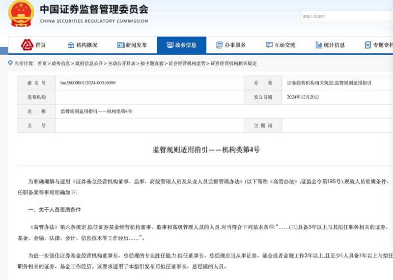 证监会发布新指引,细化证券基金经营机构高管任职要求