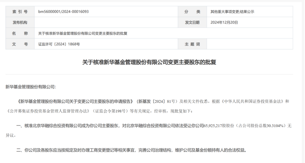 新华基金二股东变更已正式获得证监会批准。12月20日,证监会发布批复文件,正式核准北京华融综合投资有限公司成为新华基金管理股份有限公司的主要股东,对其受让新华基金6592.52万股股份(占总股份的30.3104%)表示无异议。