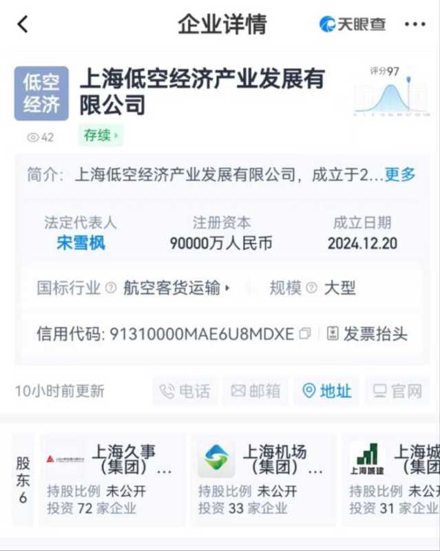 股东结构方面,上海低空经济产业发展有限公司汇聚了六家重量级股东,包括上海机场投资有限公司、上海东虹桥投资发展(集团)有限公司、上海机场(集团)有限公司、上海久事(集团)有限公司、上海城建(集团)有限公司以及上海信息产业(集团)有限公司,这样的股东阵容为其未来发展提供了坚实的支持。