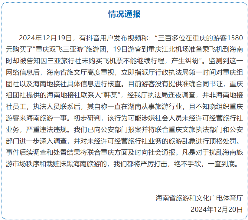 在此之前,海南省旅游和文化广电体育厅(简称“海南省旅文厅”)也已对此事发布了情况通报。据称,海南省旅文厅在监测到相关网络信息后,高度重视并立即指派行政执法局对重庆组团社以及海南地接社的具体信息进行核查。经调查发现,重庆组团社提供的海南地接社联系人“韩某”并非海南地接社员工。该行为可能涉嫌社会人员未经许可经营旅行社业务,海南省旅文厅已向公安部门报案,并将联合重庆文旅执法部门和公安部门进一步深入调查。