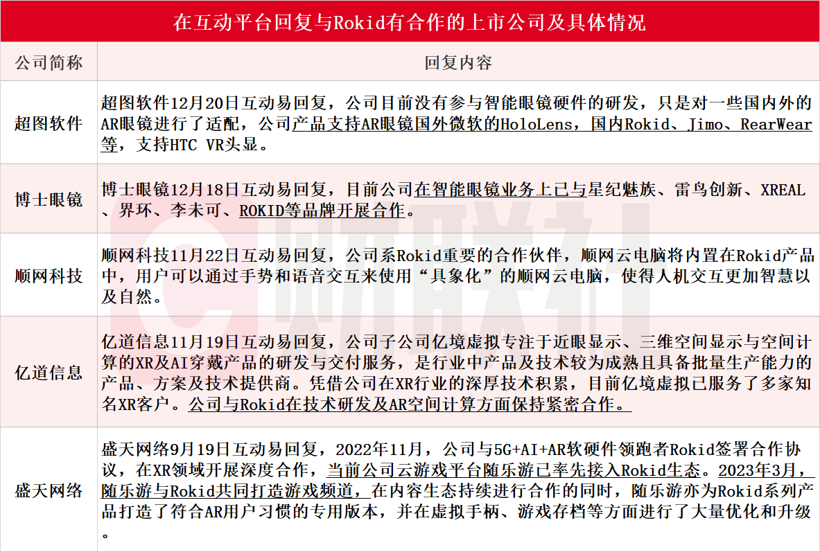 据财联社不完全统计,包括超图软件、博士眼镜、顺网科技、亿道信息、盛天网络在内的多家公司在互动平台上回复称与Rokid有合作关系。Rokid自成立以来,已陆续推出多款不同形态和使用场景的AR眼镜产品,并已成为全球文博市场占有率高达99%、覆盖90%专业AR开发者的科技品牌。