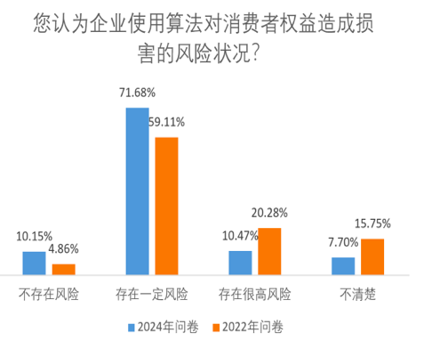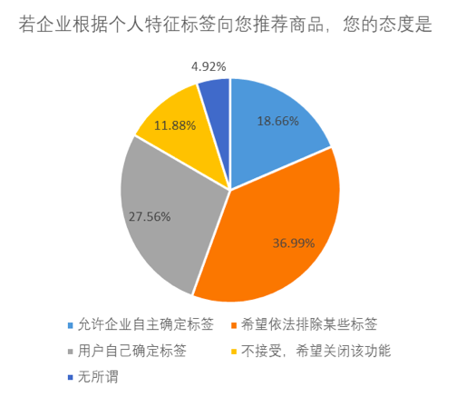 对于企业根据个人特征标签推荐商品,消费者态度不一。有36.99%受访者希望依法排除某些标签,27.56%认为应由用户自己确定标签。此外,七成受访者认为算法存在一定风险。