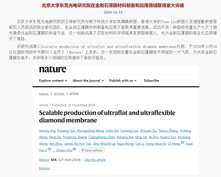 这一创新成果标志着金刚石薄膜技术领域的重大飞跃,为未来金刚石薄膜在电子、光学等多个高科技领域的应用开辟了全新的可能性。该研究成果已于12月18日在国际顶级学术期刊《自然》(Nature)上发表,引起了全球科技界的广泛关注。