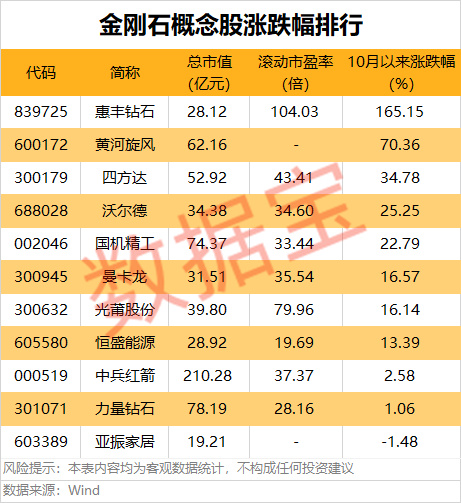 行情方面,自10月以来,多家金刚石相关企业股价大幅上涨,惠丰钻石涨幅一度超过4倍,黄河旋风连续收获涨停板,四方达、沃尔德、国机精工等涨幅也超过20%。