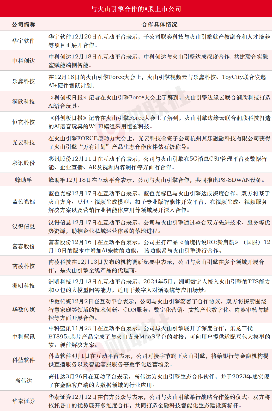 据财联社不完全统计,目前已有华宇软件、中科创达、乐鑫科技、润欣科技、恒玄科技、光云科技等在内的多家A股上市公司与火山引擎建立了合作关系,合作详情如下图所示: