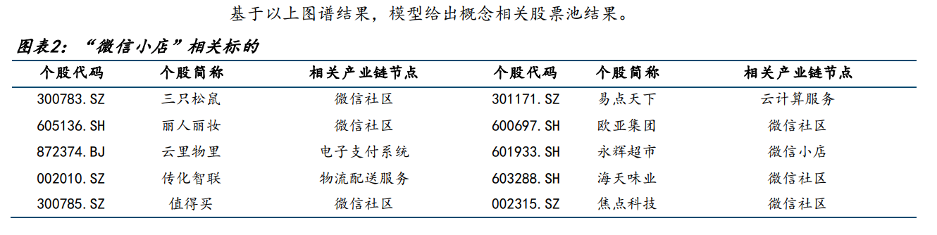 此外,国金证券使用“产业链 Agent”工具梳理出“微信小店”概念的相关产业链上下游,并整理出概念股名单,建议关注光云科技、三只松鼠、壹网壹创、盐津铺子、青木科技等公司。多家上市公司也在互动平台上回复了微信小店业务的相关情况,部分公司已开通或计划开通微信小店。