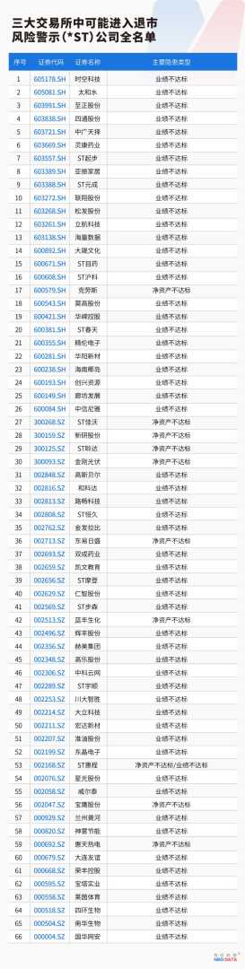 为降低投资者“踩雷”风险,每日经济新闻特别推出系列报道,本篇报道将聚焦财务类强制退市对A股上市公司的影响。经过对A股公司的深度对比分析和风险大扫描,我们发现沪深京三大交易所中,存在财务类强制退市隐患的公司共有36家(见图一),另有66家公司可能面临被*ST的风险(见图二)。这些公司应引起投资者的高度关注。