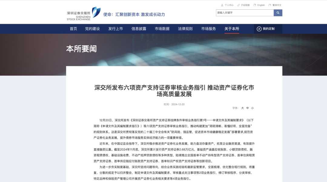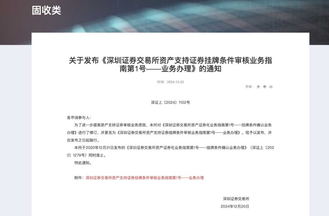 12月20日,深交所正式发布了包括《深圳证券交易所资产支持证券挂牌条件审核业务指引第1号——申请文件及其编制要求指引》在内的六项资产支持证券审核业务指引,旨在构建一套“简明清晰、易懂好用、全面完备”的规则体系。