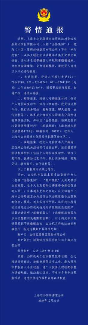 12月21日,上海警方对金恪控股集团股份有限公司、艳阳(中国)度假连锁集团有限公司及其关联企业涉嫌非法集资犯罪立案侦查,并对多名犯罪嫌疑人采取刑事强制措施。