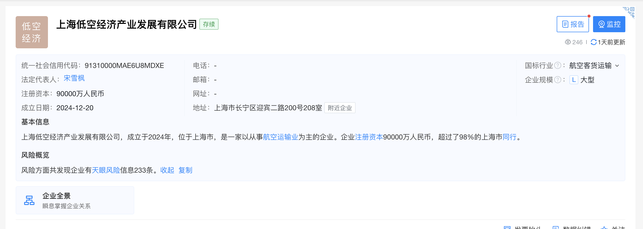 上海低空国资企业——上海低空经济产业发展有限公司已正式上线运营。天眼查数据显示,该公司于12月20日正式注册成立,专注于航空运输业,法定代表人为宋雪枫,注册资本高达9亿元人民币。