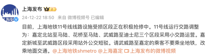 @上海发布微博消息,近日,上海地铁11号线遭遇设施受损情况,相关部门已迅速响应并展开积极抢修工作。目前,11号线的运行交路已作出临时调整:嘉定北站至马陆区段、花桥至马陆区段以及武威路至迪士尼区段均采取小交路运营模式。同时,嘉定新城至武威路区段则采用站外公交短驳的方式进行接驳。