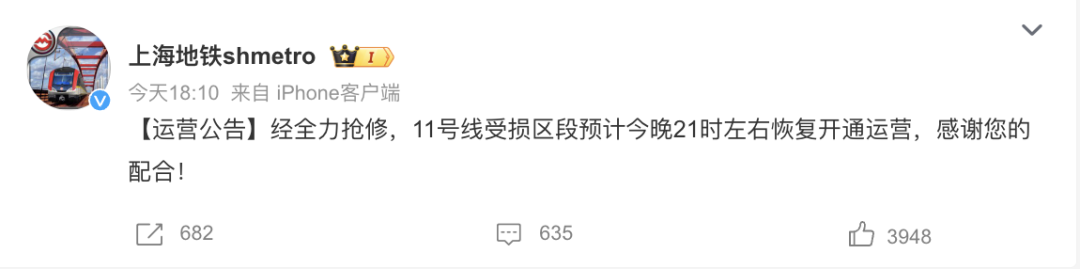 12月22日傍晚,上海地铁官方微博发布消息称,原定于21时恢复运营的11号线受损区段,截至发稿时仍未更新恢复运营的消息。百度地图公共交通显示,目前该路段地铁仍不可乘坐。
