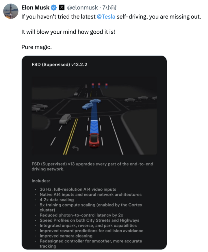 (来源:特斯拉社媒)同日,马斯克本人也在社交媒体上称赞新版本FSD为“纯粹的魔法”。