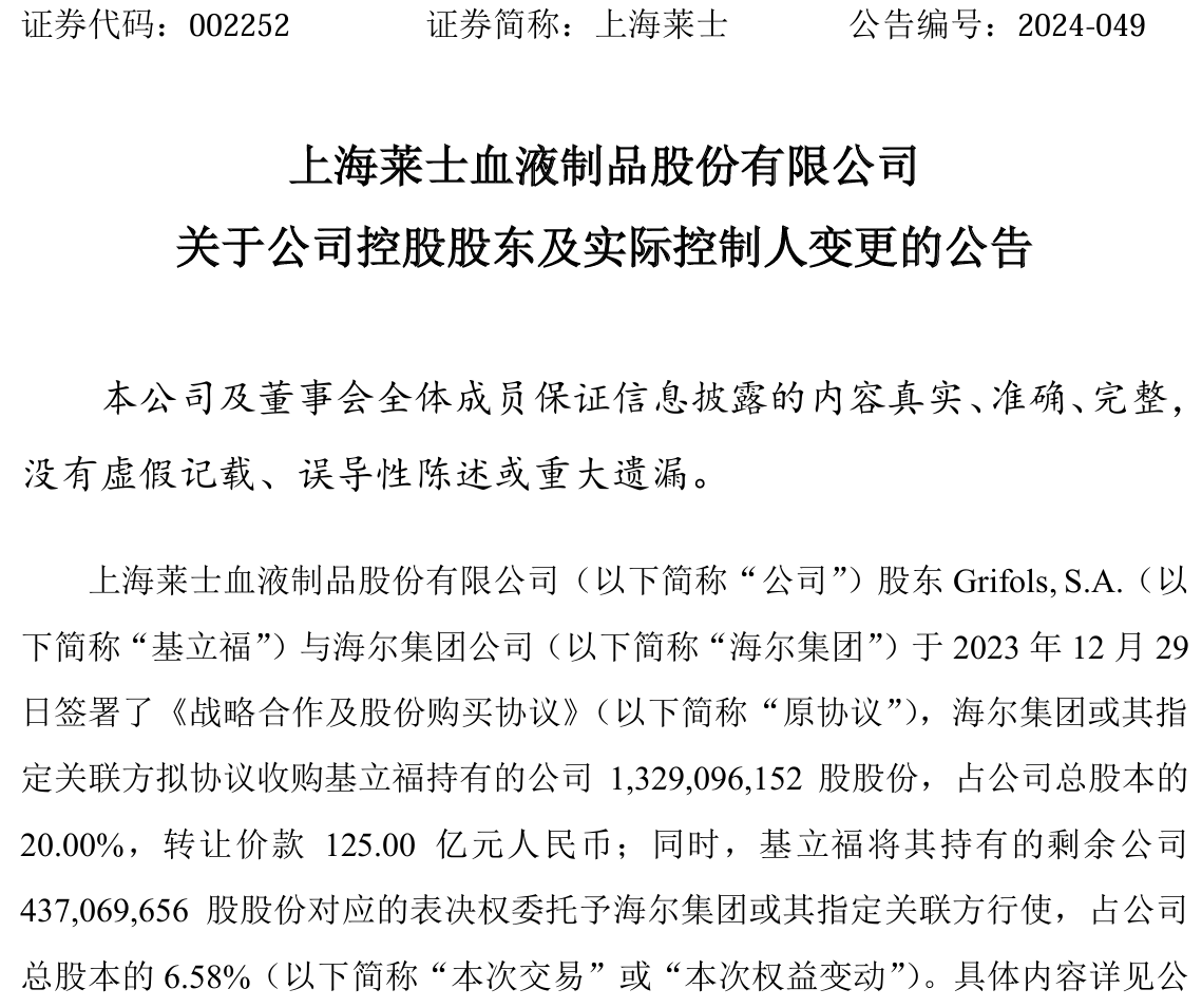 值得注意的是,海尔集团此前已斥资125亿元战略入股上海莱士,成为其重要股东。今年7月29日,上海莱士发布公告,宣布其控股股东及实际控制人发生变更,海尔集团通过海盈康(青岛)医疗科技有限公司获得上海莱士26.58%的表决权,成为其新的控股股东,海尔集团则成为实际控制人。