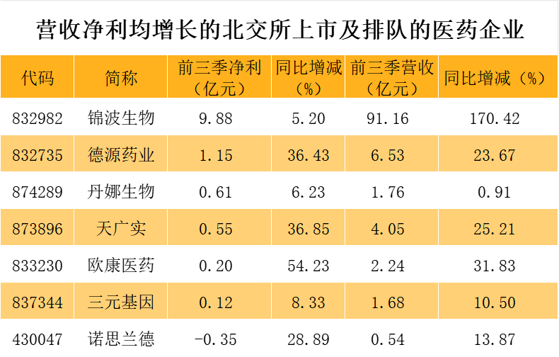 尽管整体市场环境不佳,但仍有10家公司前三季度的营收实现了同比增长,8家公司的归母净利润同比增长。其中,锦波生物、诺思兰德、德源药业、欧康医药、三元基因、丹娜生物、天广实等7家公司前三季度的营收和净利润均实现了正增长。