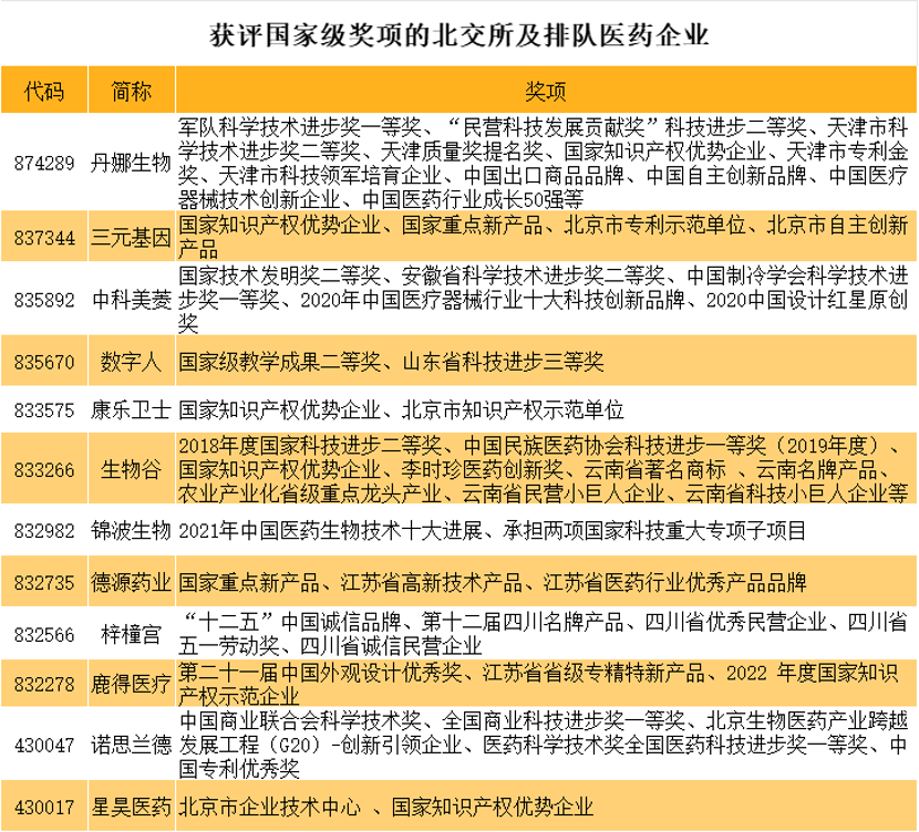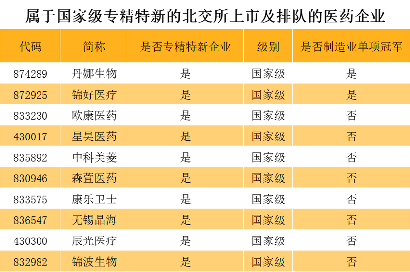 这些医药生物企业皆为“专精特新”企业,其中10家更是荣获国家级“专精特新”称号,丹娜生物与锦好医疗还同时被授予制造业单项冠军,彰显了北交所生物医药企业的高科技含量。