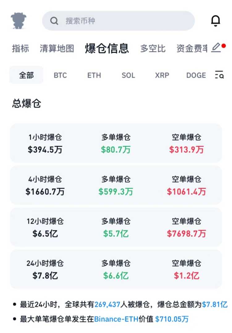多空双方在这场金融战役中展开了激烈交锋。据Coinglass数据显示,最近24小时内,全球范围内共有269437名投资者遭遇爆仓,爆仓总金额高达7.81亿美元。其中,最大单笔爆仓单发生在Binance-ETH,涉及金额达到710.05万美元,凸显了市场波动的剧烈程度。