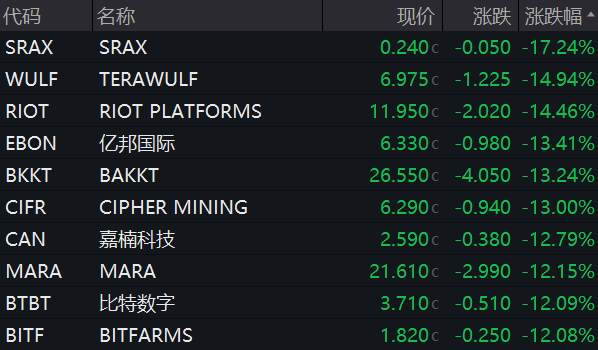 受到加密货币市场短线走低的影响,美股市场上相关概念股的表现也不尽如人意。Riot Platforms股价暴跌14.46%,嘉楠科技股价大跌12.79%,BitDigital跌幅达到12.09%,Coinbase也大幅下跌10.2%。此外,“比特币影子股”MSTR股价同样受到重创,跌幅达到9.52%,显示出市场对加密货币未来走势的担忧。