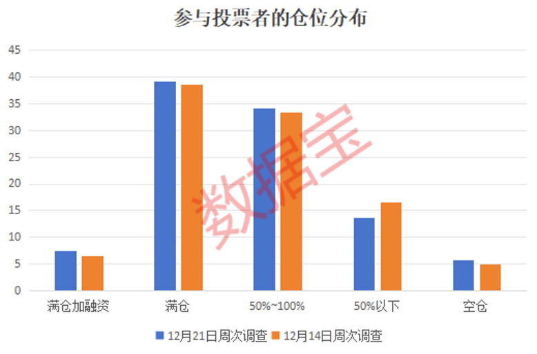 从具体仓位分布来看,满仓和满仓加融资的受访者合计占比达到46.64%,略高于上一周的45.18%。