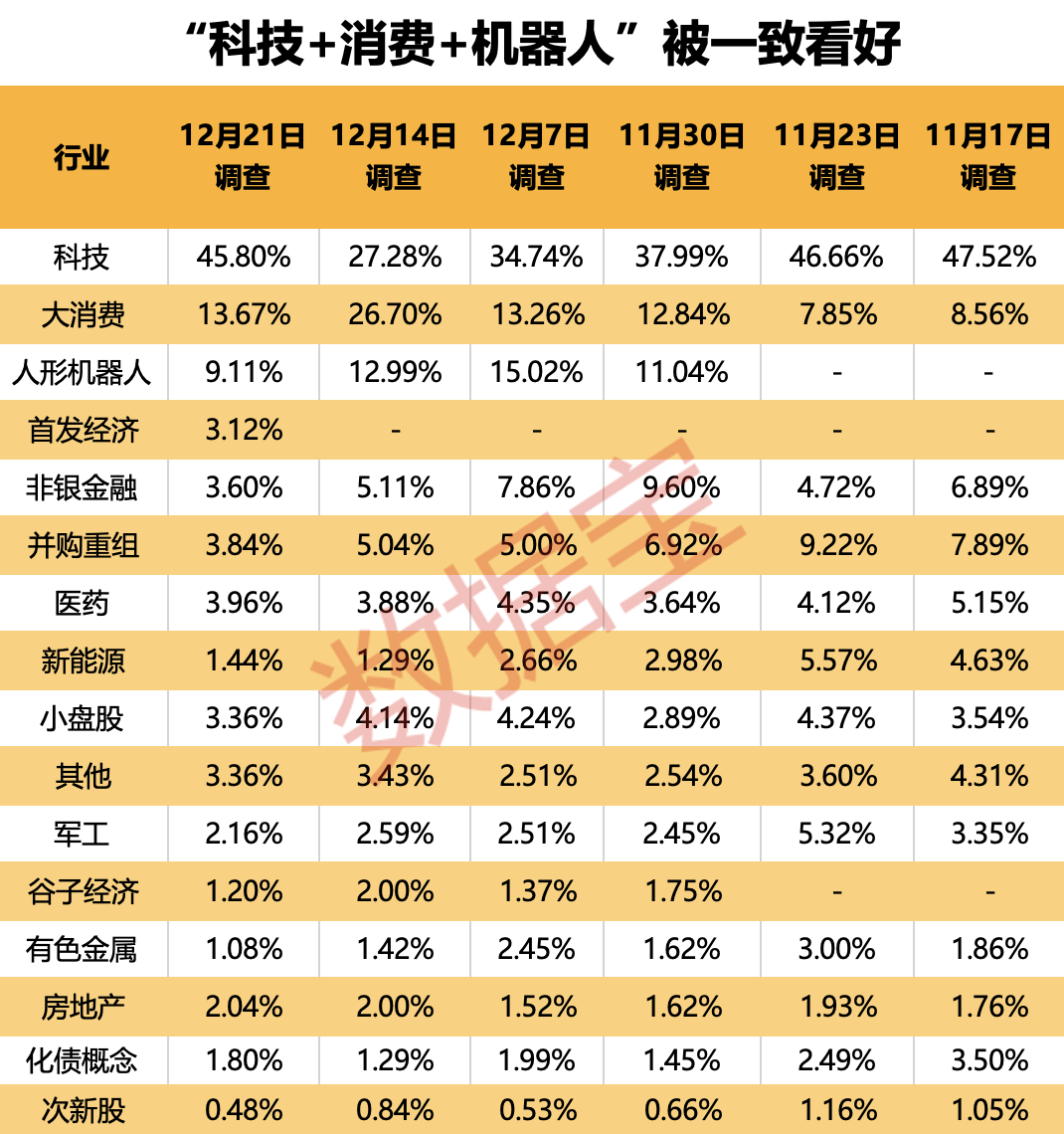跨年行情与春季躁动备受瞩目,投资者对下周市场有所期待。科技板块表现强势,受访者对科技板块一致看好的比例大幅飙升。同时,机构对市场的投资策略也进行了详细分析。