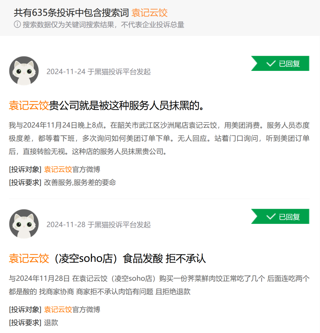 值得注意的是,这并不是袁记云饺首次被曝出食品安全问题。据投诉平台数据显示,与袁记云饺相关的投诉已达635条,涉及“食物没煮熟”、“有异物”等问题。袁记云饺曾在自查自纠食安报告中披露,2023年8月共稽核门店951家,发现解冻复冻、生熟混放、交叉污染等问题门店共119家。
