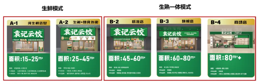 据袁记云饺招商手册显示,目前其门店有“生鲜”“生熟一体”两种门店模式,共5种店型可供加盟。加盟费用方面,高线城市主推B类生熟一体店前期投资约为36万元。此外,袁记云饺外卖平台由公司统一运营,加盟门店需承担一定比例的平台服务费和运营费用。