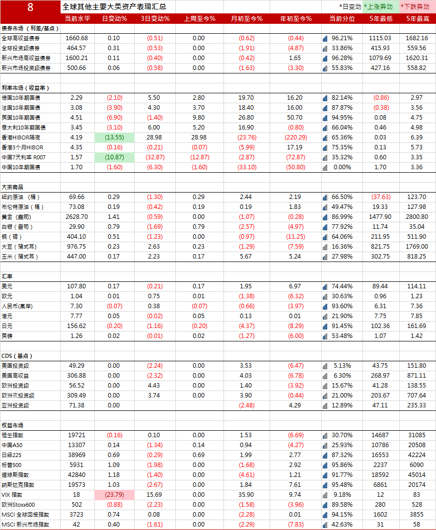 上周五,美国公布的核心PCE价格指数低于预期,这一数据直接推动了美国国债市场的上涨趋势。受此影响,收益率曲线从原先的陡化状态逐渐回归至走平状态。具体而言,2年期美国国债收益率下降了0.63个基点,最终报收于4.3102%;而10年期美国国债收益率则下跌了3.99个基点,报收于4.5222%。与此同时,英国和德国的国债市场也紧随美国国债的上涨步伐,这主要得益于美国通胀数据低于预期所带来的积极影响。然而,与债市表现不同,欧洲股市却遭遇了9月以来最大的单周跌幅,其中诺和诺德公司的股价更是大幅下跌。在英国,10年期国债收益率下降了6.9个基点,最终报收于4.510%;而在德国,10年期国债收益率也下跌了2.1个基点,报收于2.285%。