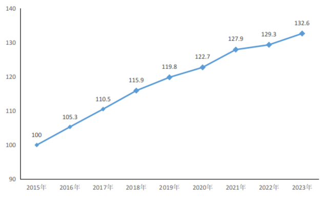 图:2015—2023年长三角区域发展指数(以2015年为基期,基期指数为100)