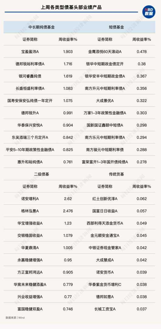 尽管存在债市投资担忧,但业内分析认为,出现明显增量利空因素的概率不高,资金面将维持均衡偏松状态,债市将继续走强,曲线将由陡峭走向平缓,增量资金将迅速填补价值洼地。上周债券基金表现中,中长期债基表现优异,单周平均收益率达0.1751%,高于短期纯债基金的0.0771%。部分中长期纯债基金单周收益率已接近2%,而短债基金最高未达0.5%。