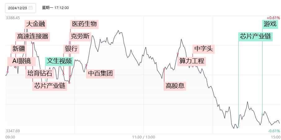 财联社12月23日讯,今日A股市场呈现显著分化,32股涨停但17股炸板,封板率维持在65%。鼎信通讯实现4连板,克劳斯6天内5次涨停,国星光电、实益达均达成3连板,宜宾纸业12天内9次涨停,卓翼科技9天5板,蒙娜丽莎5天3板,露笑科技6天3板,城地香江7天3板。然而,微盘股指数大幅下滑超过7%,全市场近4800只个股下跌,超过200只股票跌停。沪深两市全天成交额达到1.53万亿,较前一交易日增加157亿。板块方面,培育钻石、中船系、银行和保险等板块涨幅居前,而教育、Sora概念、游戏和传媒等板块则领跌。截至收盘,沪指下跌0.5%,深成指下跌1.03%,创业板指下跌0.98%。