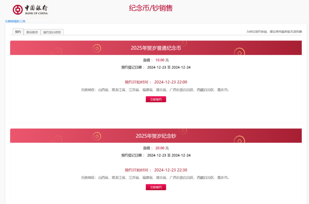 预约期:2025年贺岁币线上预约时间为2024年12月23日22时至12月24日24时;2025年贺岁钞线上预约时间为2024年12月23日22时30分至12月24日24时。客户可通过手机银行、门户网站、个人网上银行及微信公众号等渠道进行预约。