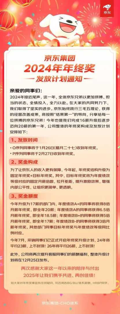 京东:12月23日,京东集团发布了2024年年终奖发放计划。今年是京东从16薪向20薪过渡的关键一年。基层员工(O序列)将于1月26日收到年终奖,而专业技术人员及项目管理人员(P序列)则将于2月27日收到。年终奖结构升级为固定年终奖+目标年终奖,旨在通过拉开奖金差距,提升激励效果,增强内部公平性。在升级为17薪的部门内,年度绩效A+的同事将获得全年20薪的待遇。