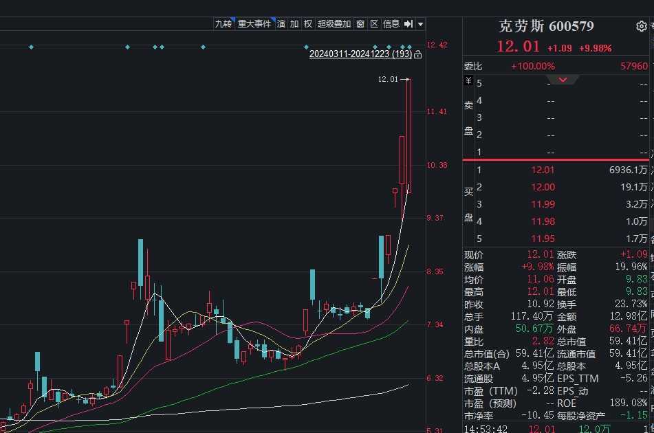 净资产为负值的央企上市公司克劳斯(600579.SH)在近六个交易日内竟有五日涨停,总市值攀升至59.41亿元,这一异常走势引发了市场的广泛关注。