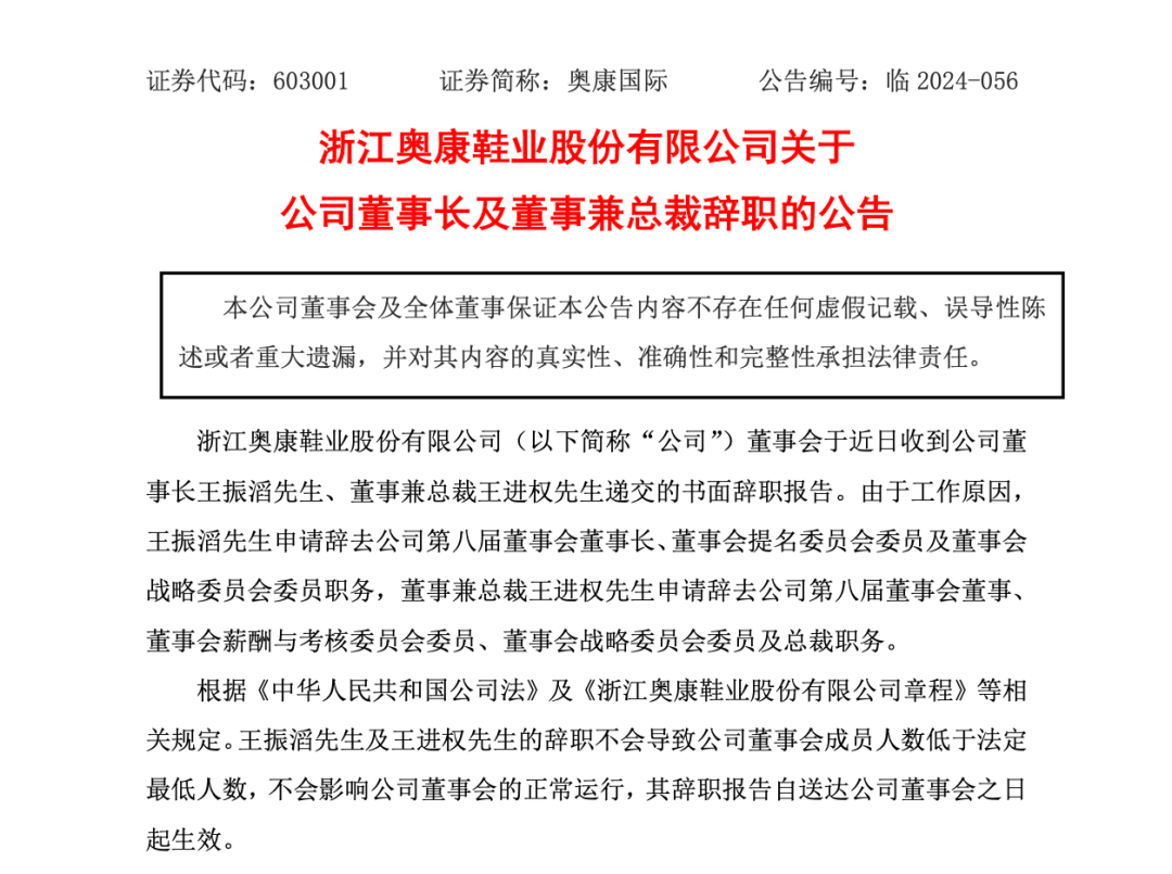 同日,奥康国际还宣布董事长王振滔、董事兼总裁王进权均已辞任。
