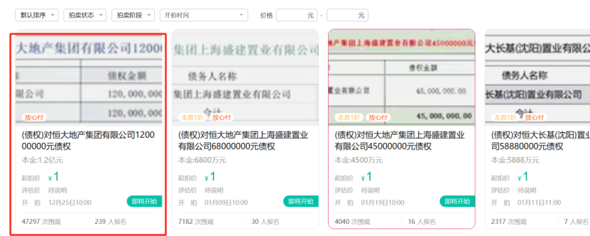 此外,阿里资产·司法拍卖平台上还出现了恒大地产集团上海盛建置业有限公司6800万元、4500万元债权,恒大长基(沈阳)置业有限公司5888万元债权,以及成都恒大御府首期二期等2户105.20万元工程款债权等四项拍卖,起拍价同样为1元,起拍日期分别为2025年1月9日、1月19日、1月11日和1月5日。目前,这些拍卖项目均有人报名参加。