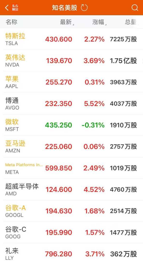 美股市场的大型科技股中,英伟达、英特尔继续领跑,涨幅均超3%,Meta、特斯拉亦不甘示弱,涨幅超过2%,谷歌紧随其后,涨幅超1%。苹果、奈飞、亚马逊同样收获小幅上涨;而微软则略微走低。