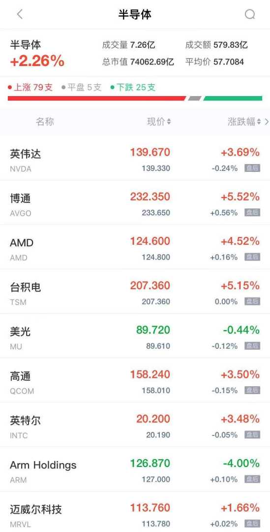 芯片板块同样亮眼,费城半导体指数涨幅超过3%。其中,高通凭借在ARM芯片诉讼案中的关键胜利,股价上涨3.5%;台积电涨幅达到5.15%;Wolfspeed更是飙升10.09%;AMD、博通同样表现出色,涨幅分别达到4.52%与超过5.5%;而Arm控股则一度走低,跌幅超过6.6%。